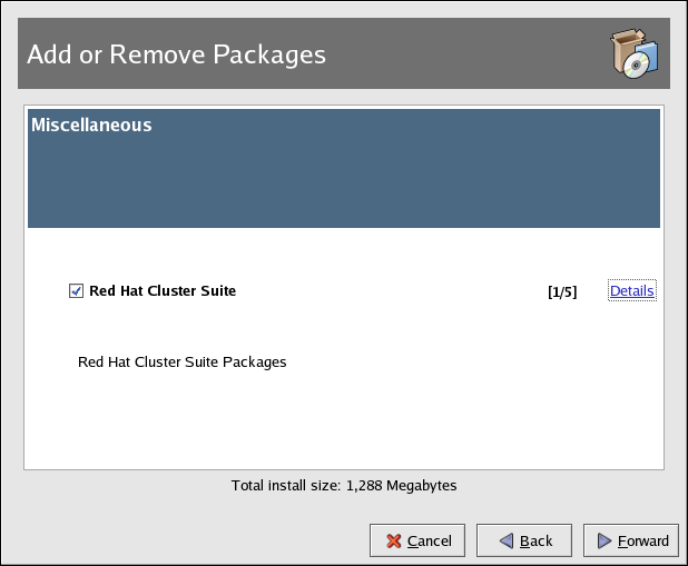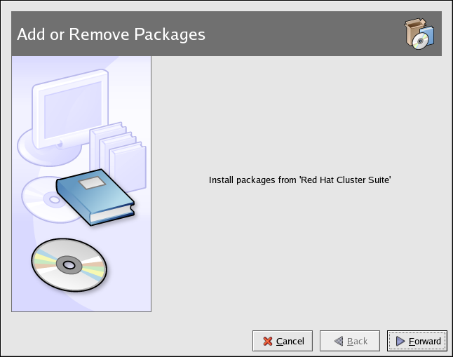 1. Insert the Red Hat Cluster Suite CD in your CD-ROM drive. If you are using a graphical desktop, the CD will automatically run the Package Management Tool. Click Forward to continue.