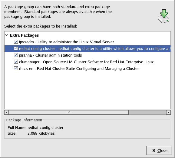 3. While viewing the package group details, check the box next to the packages to install. Click Close when finished.