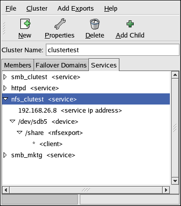 To modify your NFS service configuration, click the Services tab in the Cluster Configuration Tool and click the triangular icon next to the NFS service to display the full child tree for the service. Double-click each child to modify options.