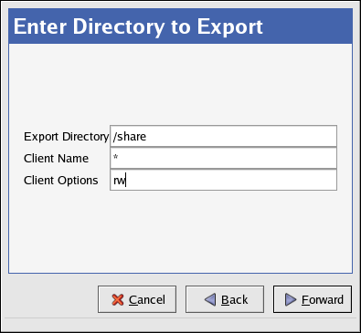 4. Enter the Export Directory — Specified as a child of a device, the export directory can be the same as the mount point. In this case, the entire file system is accessible through NFS. Alternatively, you can specify a portion (subdirectory) of a mounted file system to be mounted (instead of the entire file system). By exporting subdirectories of a mountpoint, different access rights can be allocated to different sets of NFS clients.