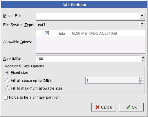 • Force to be a primary partition: Select whether the partition you are creating should be one of the first four partitions on the hard drive. If unselected, the partition is created as a logical partition. Refer to Section D.1.3 Partitions within Partitions — An Overview of Extended Partitions, for more information.