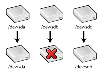 If a hard drive is physically moved to a different location in the machine, is removed, or fails to initialize, some of the device names will change, potentially leaving device name references invalid. For example, as shown in Figure 7-1, if a system has three SCSI hard drives, and the second SCSI hard drive is removed, /dev/sdc becomes /dev/sdb, causing any references to /dev/sdc to become invalid and any references to /dev/sdb invalid as well since it is a different drive.