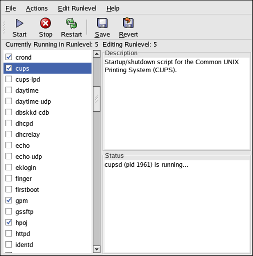 To enable a non-xinetd service to start at boot time for the currently selected runlevel, check the checkbox beside the name of the service in the list. After configuring the runlevel, apply the changes by selecting File => Save Changes from the pulldown menu. The runlevel configuration is changed, but the runlevel is not restarted; thus, the changes do not take place immediately.