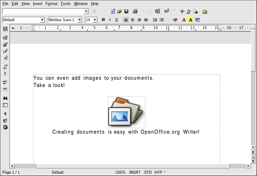 While OpenOffice.org Writer is useful for general document editing, you can also add objects such as images, illustrations, charts, and tables to your document to complement your text or give impact to your documents. To add an image to the document, select Insert => Graphics => From File, and choose the image from the pop-up file browser. The image appears where you placed your cursor and can be made larger or smaller by clicking on the resizing borders around the image. Figure 7-2 shows an image added to a document.