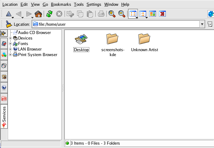 Konqueror opens up in a window on your desktop, allowing you to navigate through your home directory and throughout your Red Hat Enterprise Linux file system. After exploring, you can return to your home directory by clicking the Home button on the toolbar.