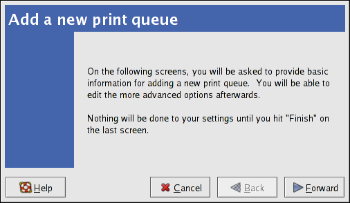 To add a local printer, such as one attached through a parallel port or USB port on your computer, click the New button in the main Printer Configuration Tool window to display the window in Figure 24-2. Click Forward to proceed.