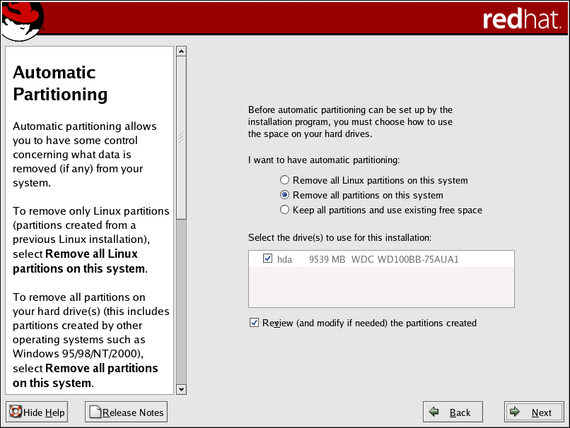 • Remove all Linux partitions on this system — select this option to remove only Linux partitions (partitions created from a previous Linux installation). This does not remove other partitions you may have on your hard drive(s) (such as VFAT or FAT32 partitions).