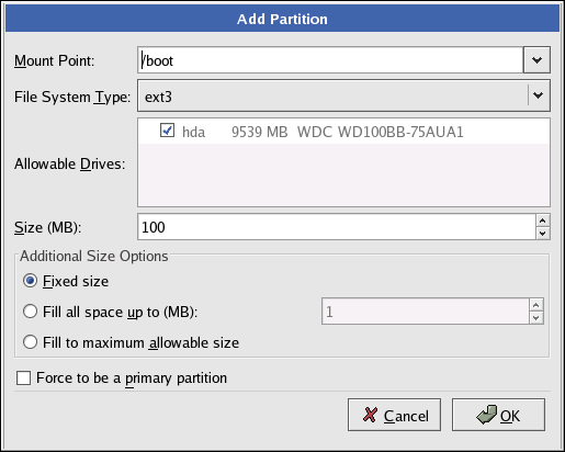 • Force to be a primary partition: Select whether the partition you are creating should be one of the first four partitions on the hard drive. If unselected, the partition is created as a logical partition. Refer to Section D.1.3 Partitions within Partitions — An Overview of Extended Partitions, for more information.