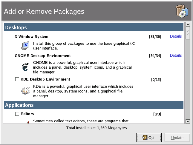 The main window shows a list of package groups. If the package group has a checkmark in the checkbox beside it, packages from that group are currently installed. To view the individual packages list for a group, click the Details link beside it. Individual packages with a checkmark beside them are currently installed.