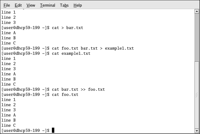 The following screen demonstrates cat's concatenate function, adding the contents of bar.txt to the end of foo.txt. Without redirection to the file example1.txt, cat displays the concatenated contents of foo.txt and bar.txt on the screen.